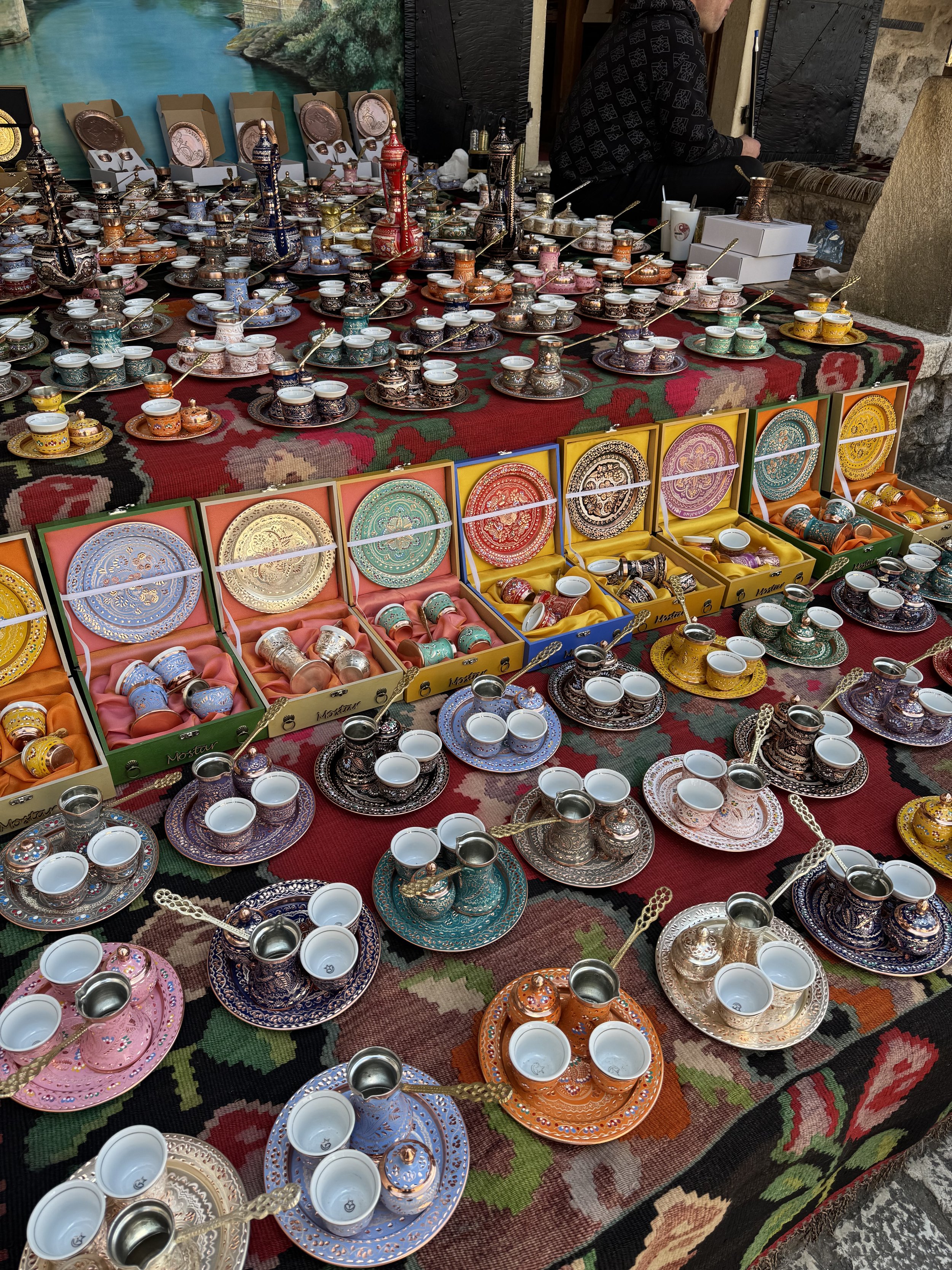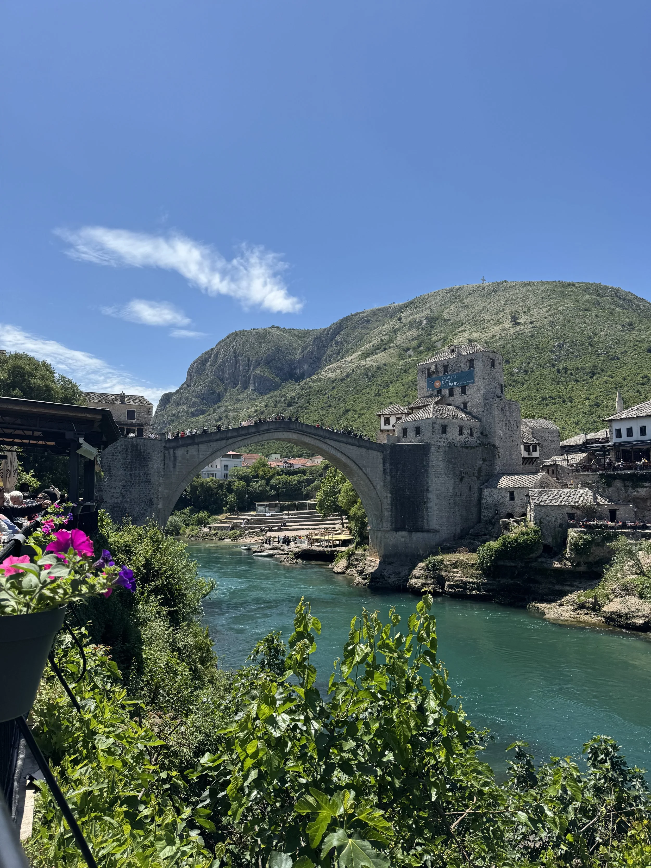With shaky breaths, I continued on the dirt path until it became a beautiful cobblestone road through a bustling Bazaar. Local artwork, jewelry, and Bosnian coffee sets (kahveni takum) brought color and liveliness to the small walkway. With wide eyes and a bustling mind, I moved with the flow of the crowd towards the iconic Stari Most Bridge that I had been anxious to see, and it did not disappoint. The 24-meter limestone bridge stands tall in the Old Town, appearing to have stood for centuries, but it is only about 30 years old. The original bridge, dating back to the 1560s, was unfortunately destroyed by Bosnian Croats during the Bosnian War in the 1990s, along with most of the Old Town.